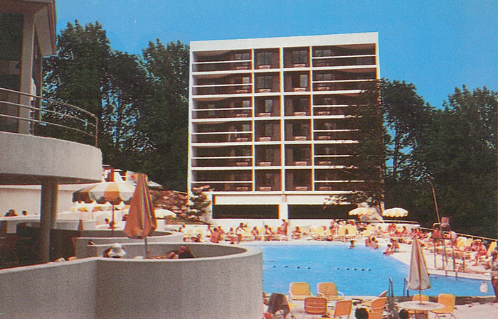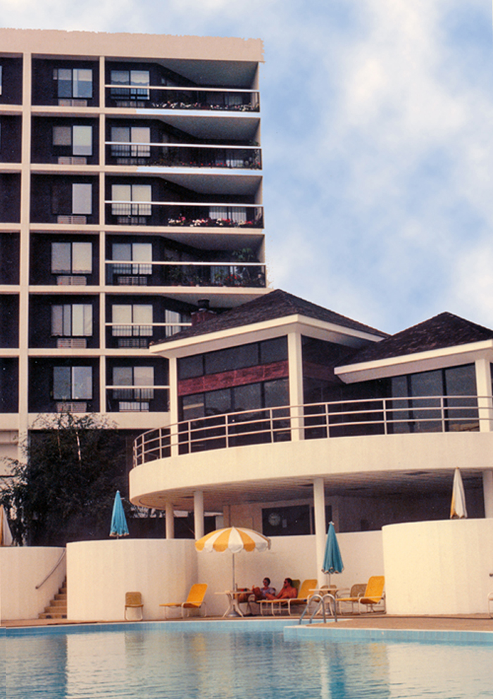 site which slopes 100 feet in its 400 foot width. Three of the five six-story buildings utilize the site slope to provide parking below. The sculptural form of the pool and recreational facility blends into the dynamic topography creating happy